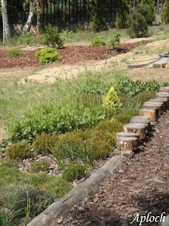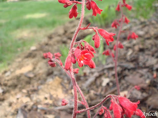 Niemniej za murkiem ziemia została nieco podniesiona i zamieszkały za murkiem żurawki. Mają przepiękne kwiaty - krwistoczerwone - o średniej wysokości kwiatostanu.