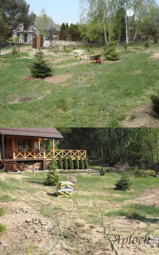 W niedzielę (5 maja) pogoda była iście tropikalna i zabraliśmy się za syzyfowe prace: odchwaszczenie mechaniczne miejsc pod sadzonki, doły, zaprawienie ziemi "jedzonkiem" i zapakowanie wielko-drzew do dołów. Ufff.... nagimnastykowaliśmy się, nie powiem. Ale chyba było warto. Teraz podlewanie, podlewanie i jeszcze raz podlewanie.